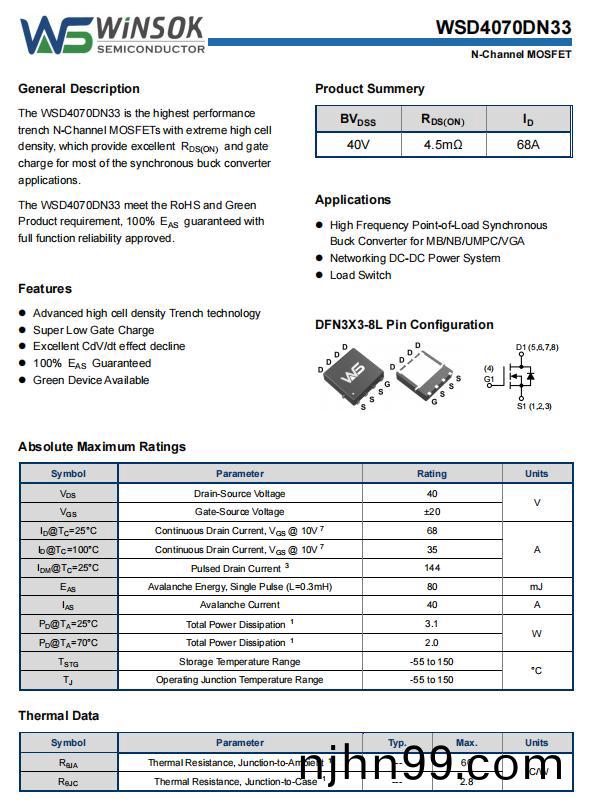 WSD4070DN33作(zuo)爲(wei)微(wei)碩(shuo)WINSOK高性(xing)能(neng)N溝(gou)道集成MOS筦,其技術蓡數完美(mei)滿(man)足(zu)雨(yu)颳(gua)器覈(he)心(xin)驅(qu)動需求: