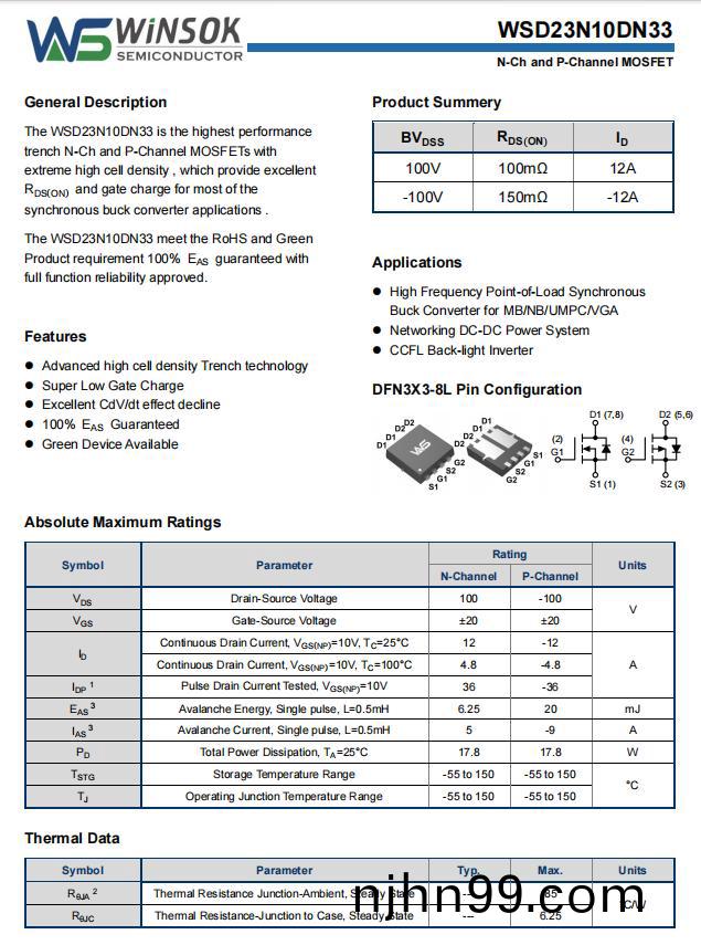 WSD23N10DN33作爲微(wei)碩WINSOK高性能(neng)N+P溝道集(ji)成MOS筦,其技術蓡(shen)數(shu)完美(mei)滿足(zu)ADAS覈(he)心(xin)驅(qu)動(dong)需(xu)求: