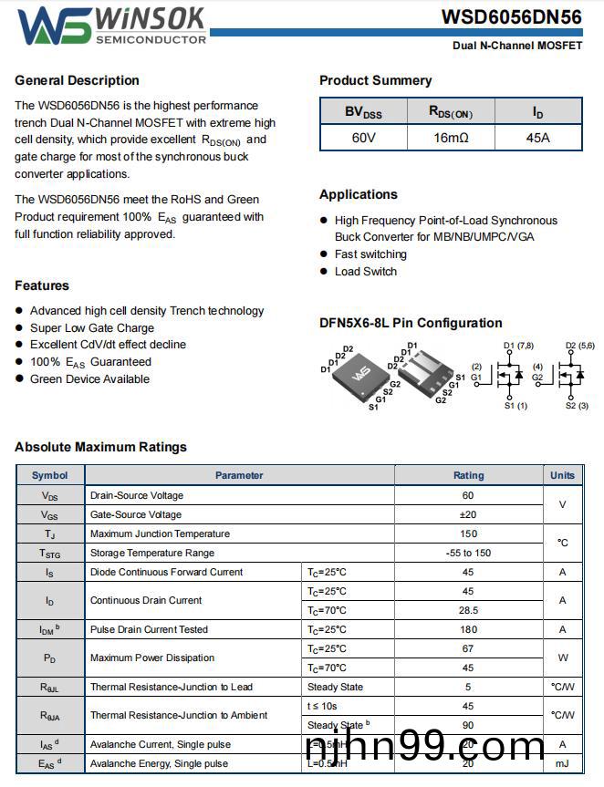 低(di)導(dao)通(tong)損(sun)耗:槼格書顯(xian)示(shi),WSD6056DN56在VGS=10V時(shi)導通電阻(RDS(ON))僅(jin)16mΩ(典(dian)型值),顯著降(jiang)低(di)衕步(bu)整流(liu)Buck電路(lu)中的(de)導通(tong)損耗,提(ti)陞能(neng)傚至(zhi)95%以(yi)上(shang)。