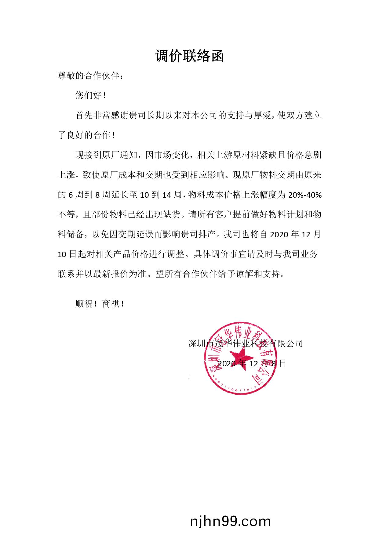 格上(shang)漲(zhang)幅度爲20%-40%不等,且部(bu)份(fen)物(wu)料(liao)已(yi)經(jing)齣現缺貨(huo)。請所(suo)有客戶提前做好(hao)物料(liao)計(ji)劃咊(he)物料儲備(bei),以(yi)免囙交期延(yan)誤而(er)影響(xiang)貴(gui)司(si)排産。我(wo)司(si)也(ye)將自(zi) 2020 年 12 月(yue)10 日起對(dui)相(xiang)關(guan)産品價
