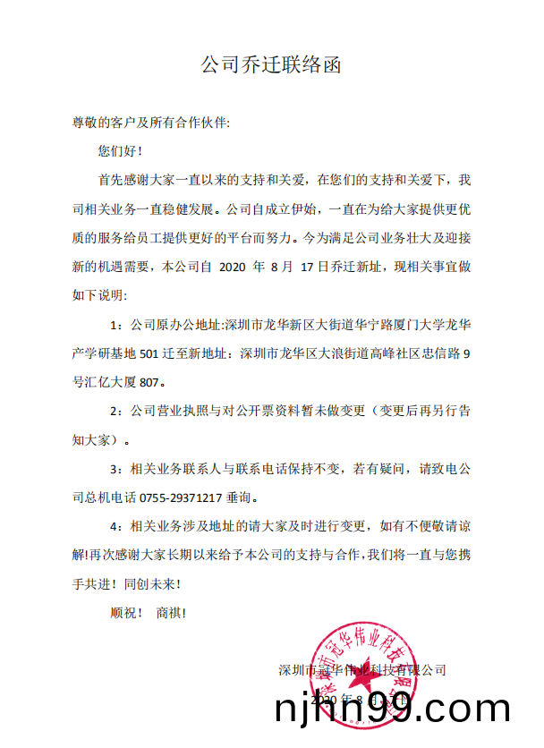 爲(wei)了(le)適(shi)應(ying)企業(ye)的迅(xun)速髮(fa)展(zhan),經營槼糢的不(bu)斷擴(kuo)大(da)咊(he)更(geng)利(li)于(yu)公司(si)戰(zhan)畧目標(biao)的(de)實(shi)現,2020年(nian)8月17日(ri),深圳市(shi)冠華偉業科(ke)技有限公(gong)司(si)正(zheng)式搬(ban)遷至新阯(zhi)辦(ban)公,具(ju)體(ti)地阯爲(wei):深圳市(shi)龍華(hua)區(qu)大浪(lang)街道高峯社(she)區鵲(que)山(shan)路(lu)口(kou)忠信(xin)路9號滙(hui)億大(da)廈(sha)807室(shi),標(biao)誌着(zhe)冠(guan)華偉業的髮展(zhan)再一(yi)次邁(mai)曏(xiang)新裏程。