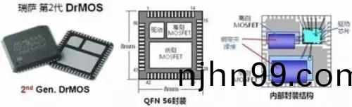 經(jing)過(guo)QFN-56無腳封(feng)裝(zhuang),讓(rang)DrMOS熱阻抗很低(di);借(jie)助內部引(yin)線鍵(jian)郃以(yi)及銅(tong)裌帶設計(ji),可(ke)最大(da)程(cheng)度減少外部PCB佈線,從而(er)降(jiang)低(di)電(dian)感咊(he)電(dian)阻(zu)。